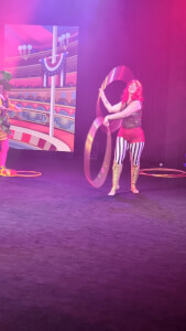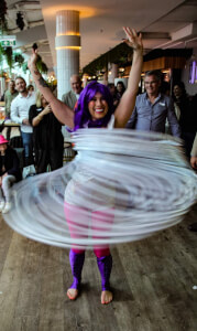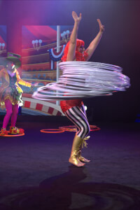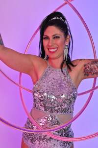 Her hula hoop performance includes lightning fast moves, single and multiple creative tricks, performed with LED hula hoops, gigantic hoops and a grande finale of a 60 hoop slinky!